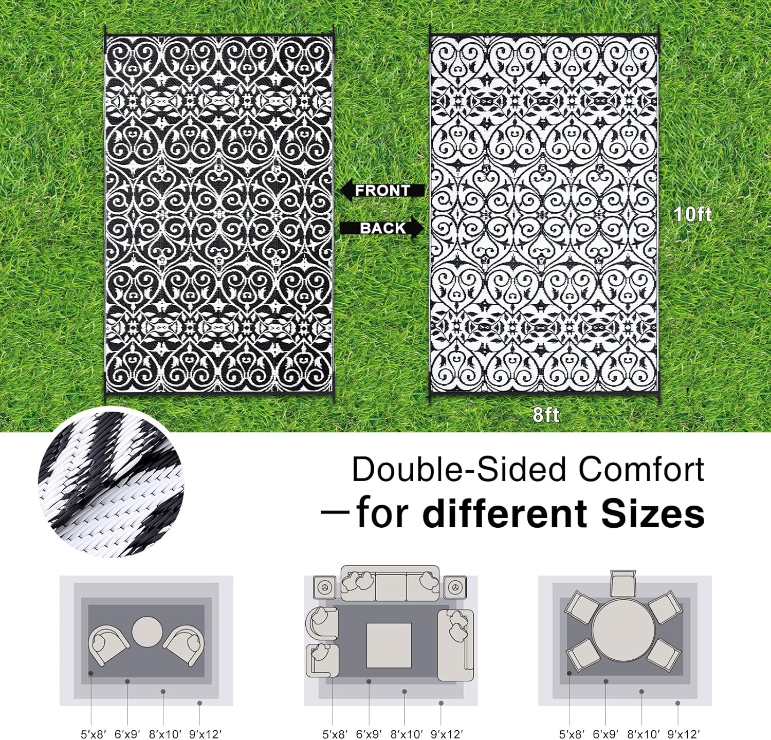 OLANLY Outdoor Rug Waterproof 8x10 ft Clearance, Reversible Outdoor Plastic Straw Rug with Floral Pattern, RV Mat for Patio, Camping, Balcony, Deck, Backyard, Black & White
