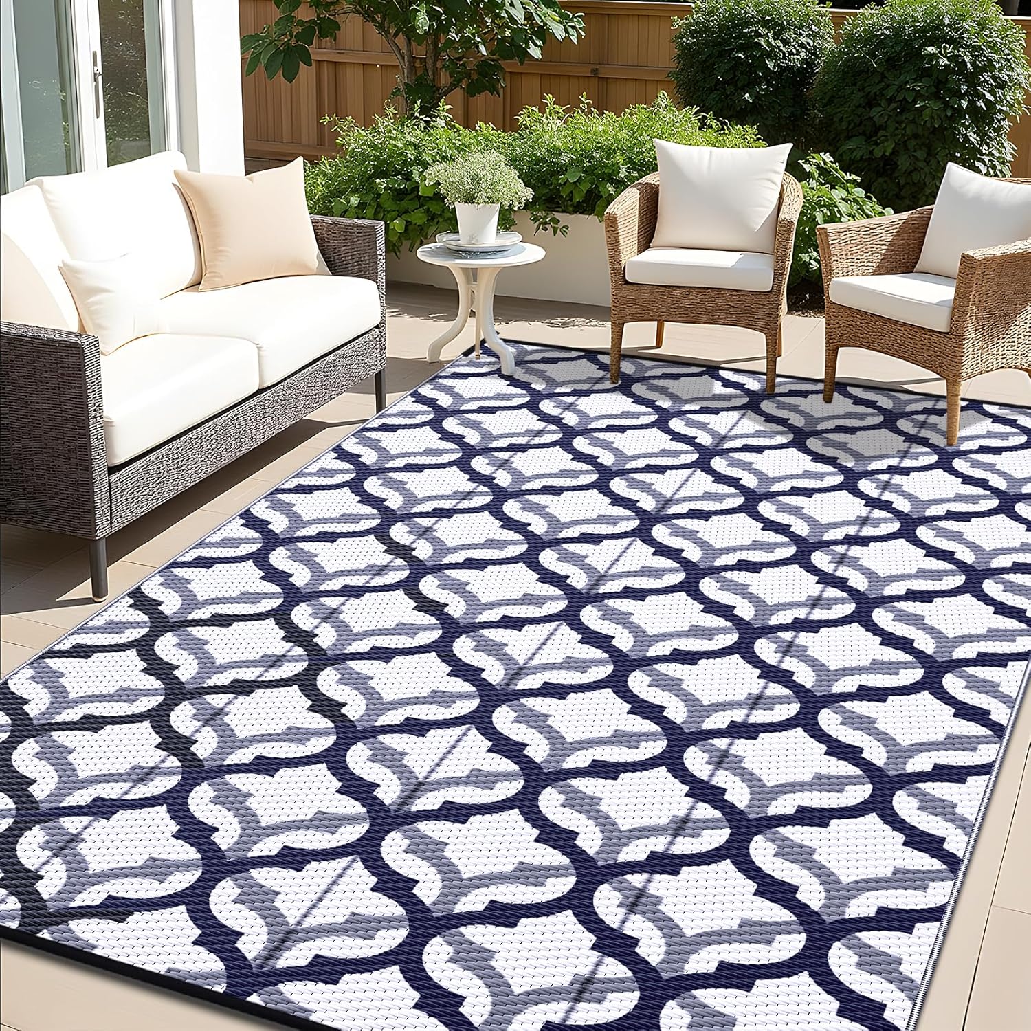OLANLY Reversible Outdoor Rug 6x9 ft Clearance, Waterproof Outdoor Plastic Straw Rug with Interlacing Pattern, RV Mat for Patio, Camping, Balcony, Deck, Backyard, Navy & White
