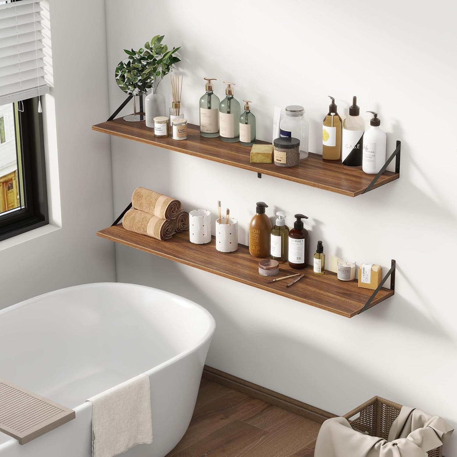 • 【FARMHOUSE RUSTIC WALL SHELF】These floating shelves are made of premium engineered wood board and visible triangular bracket. The rustic wooden grain surface add character and warmth to any modern or traditional interior with these deep floating shelves, contrast shelves at staggering heights on the wall or mount side-by-side or in the corner for a clean streamlined look.