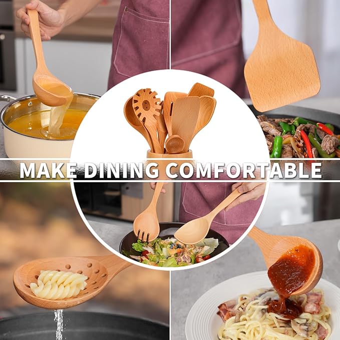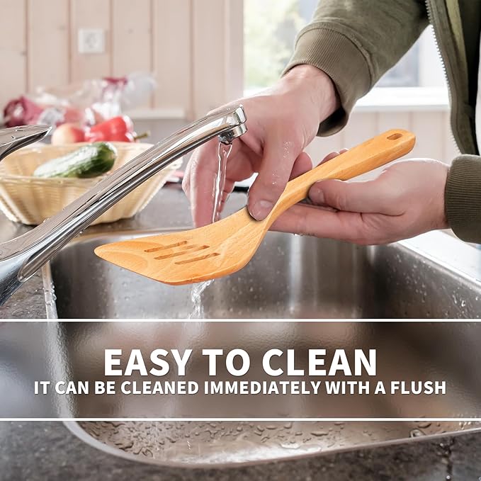 • NATURAL Beech WOOD: Crafted from solid teak wood, our utensil set is 100% handmade and eco-friendly. It's durable and crack-free, unlike silicone or bamboo alternatives. Note: Natural wood utensils may have slight color variations.