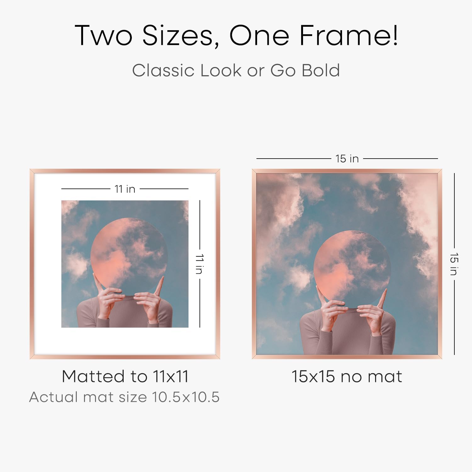 • MATTED OR EDGE-TO-EDGE—YOUR CALL. A crisp 11x11 white mat creates negative space, elevating your image with gallery precision. Or remove it for 15x15 bold, uninterrupted impact.