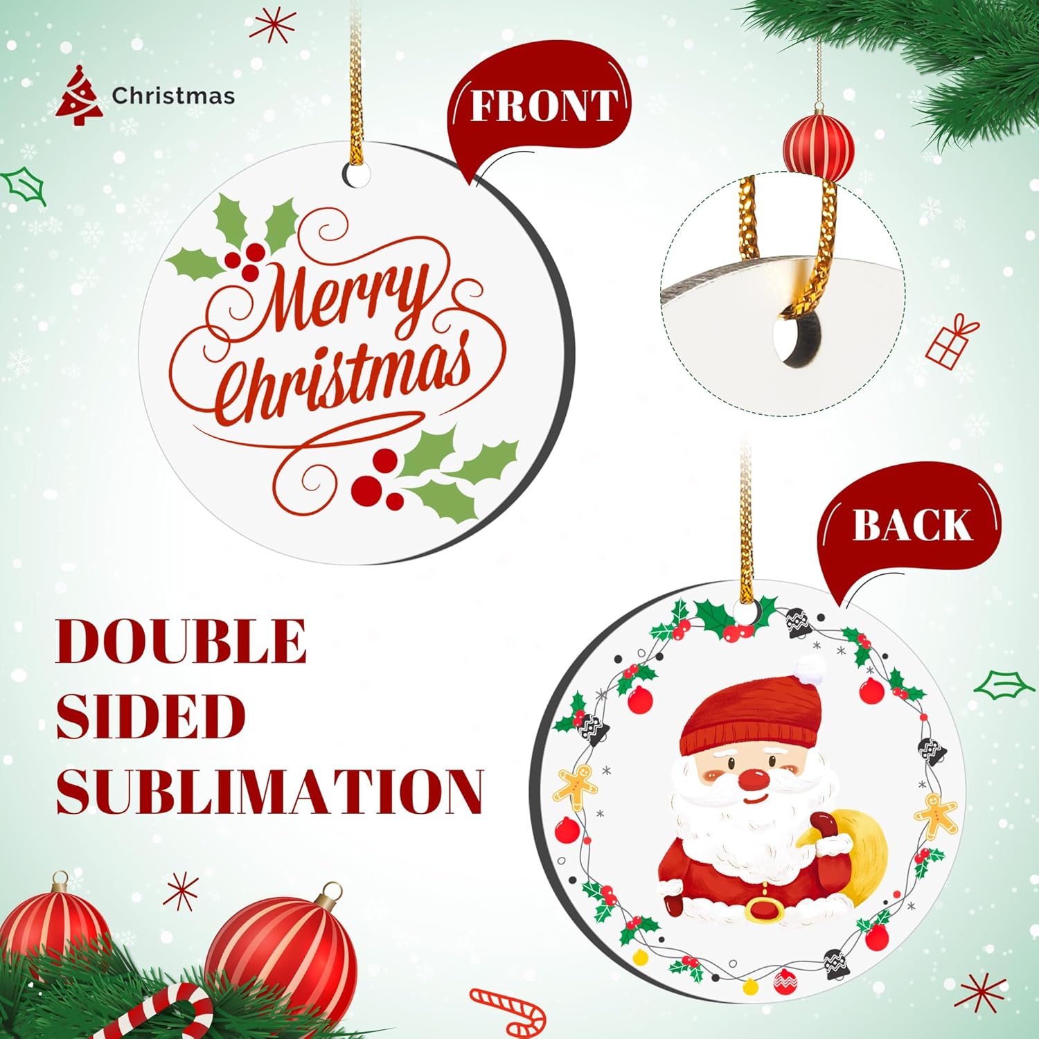 • Double-Sided Sublimation: Our white sublimation christmas ornament blanks are coated with sublimation material on both sides, allowing you to print your desired pattern on either side for more creative possibilities