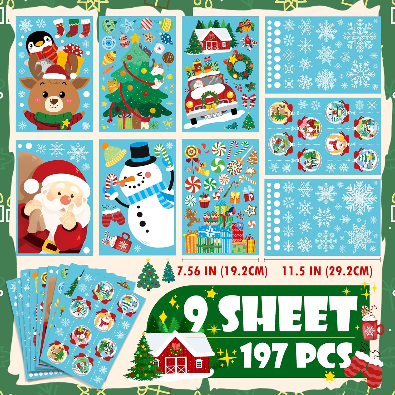 Christmas Window Clings - Christmas Large Window Stickers for Glass Window, Reusable Static Vinyl Double-Sided Winter Decals, Cute Snowflake Snowman Holiday Xmas Decorations, 197 PCS/9 Sheet