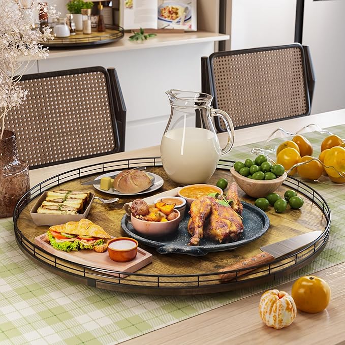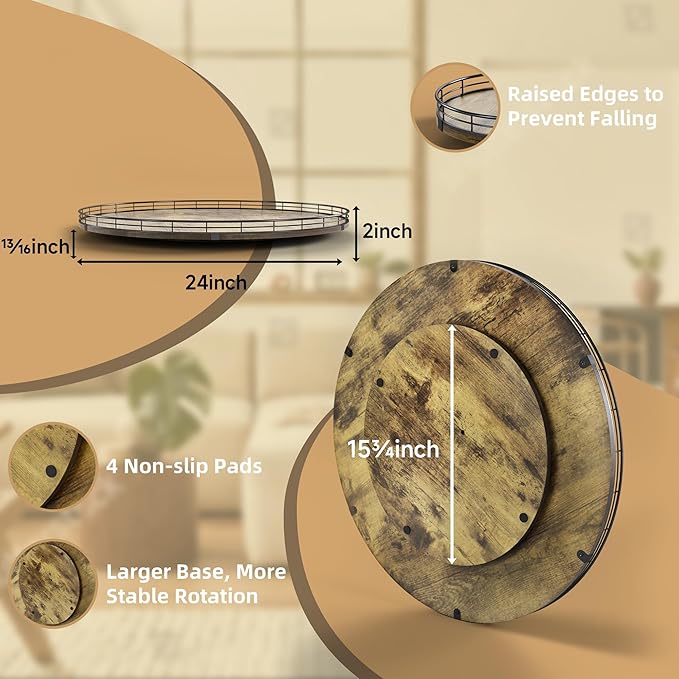 Lazy Susan Turntable Organizer for Table Top, 24’’ Round Wooden Lazy Susan for Cabinet Kitchen Countertop Pantry Dining Coffee Table for Condiments Spices, Rustic Bathroom Vanity Tray for Soap Candle