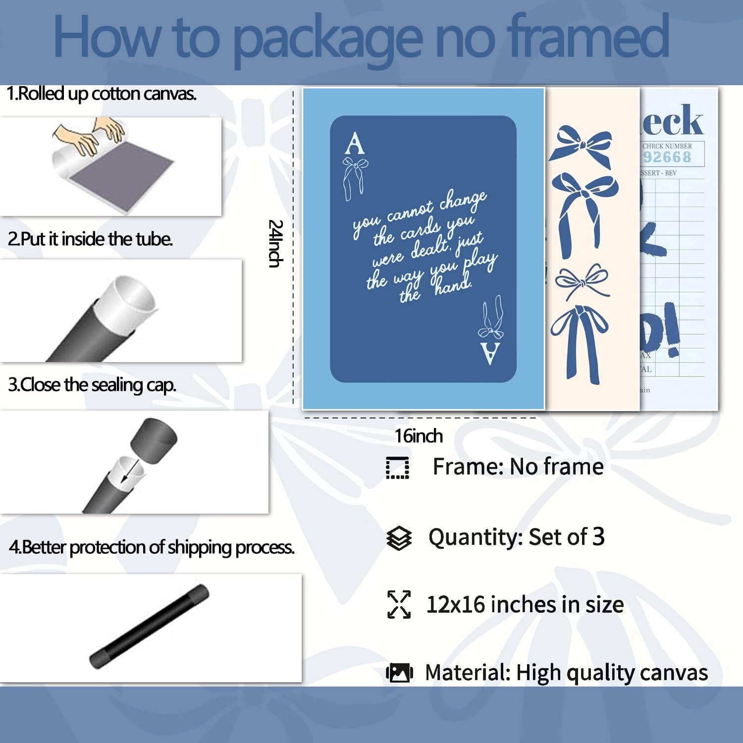 Blue Preppy Wall Art Set of 3 Trendy Navy Bow Posters Retro Guest Check Canvas Prints Poker Painting Minimalist Positive Quote Picture Decor Aesthetic for Living Room Dorm Apartment 16x24in Unframed