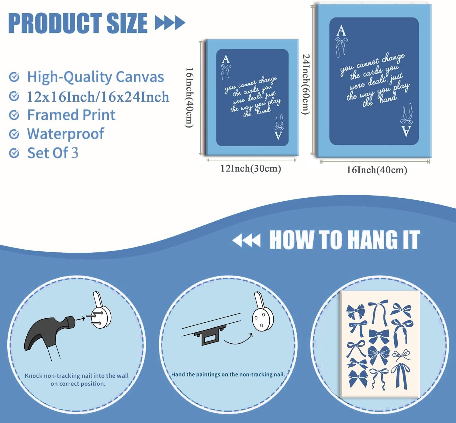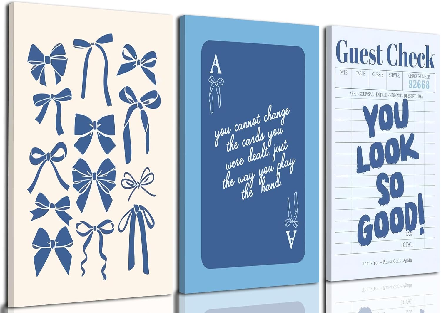 Blue Preppy Wall Art Framed Set of 3 Trendy Navy Bow Posters Retro Guest Check Canvas Prints Poker Painting Minimalist Positive Quote Picture Room Decor Aesthetic for Living Room Dorm Apartment16x24in
