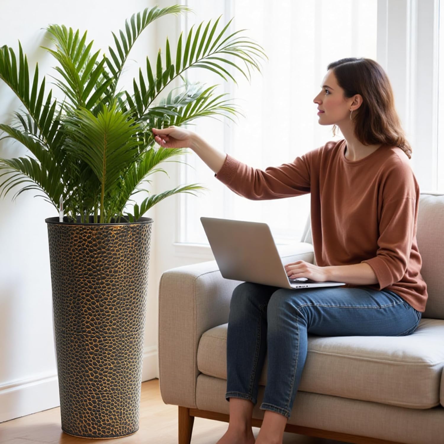 • Hand-Hammered Texture: These tall cone-shaped metal planters showcase a unique, hand-hammered texture, creating a striking focal point for any indoor or outdoor space. Each planter measures 28" in height, with a 13" top diameter and a 9.5" bottom diameter. Made of durable metal with a classic bronze finish, perfect for long-term use.