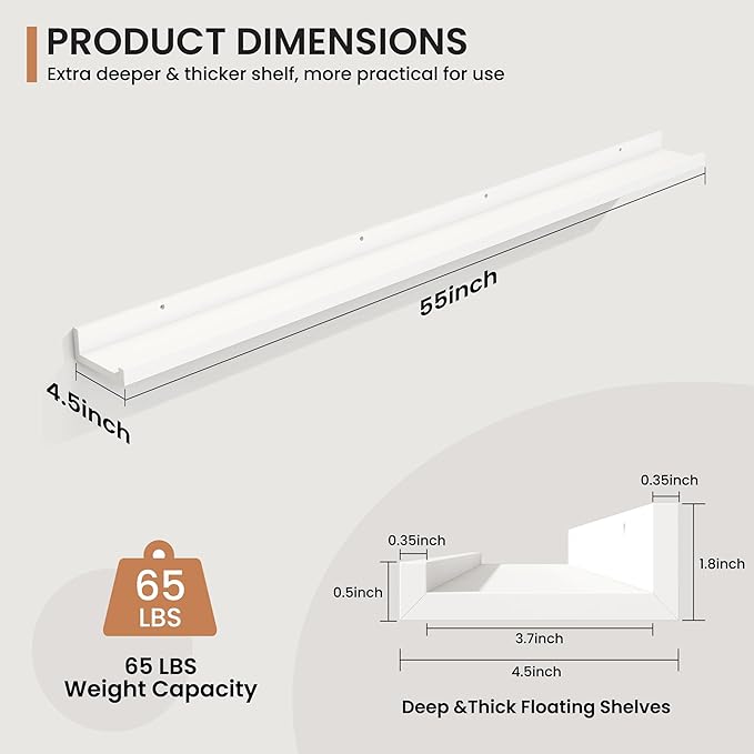 • Enhanced Stability Design: Featuring a secure lip at the front, these floating shelves prevent items from slipping or falling, confidently supporting up to 65 lbs, making these MDF wood shelves ideal for showcasing cherished items.
