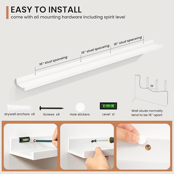 • Effortless Installation: Each shelf comes with pre-drilled holes and all necessary hardware, making installation quick and easy, so you can enjoy your new decor in no time.