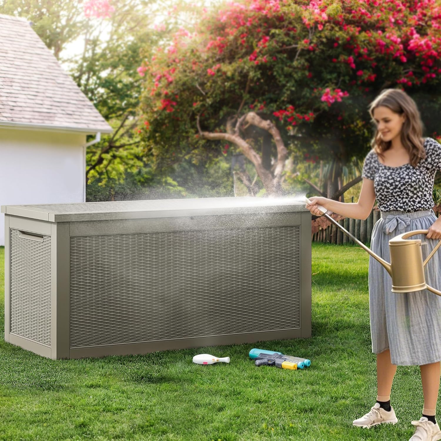 • Long-Lasting Durability: Crafted from weather-resistant resin, this pool storage box is waterproof and resists rust, water, UV rays, fading, and bending, making it ideal for long-term outdoor use; The stylish wicker texture seamlessly blends with your patio furniture