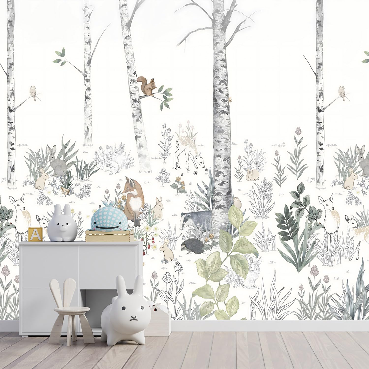 -Nursery Cartoon Woods Hand-Painted Animal Wallpaper Children's Room XT10 L 180" x 115"