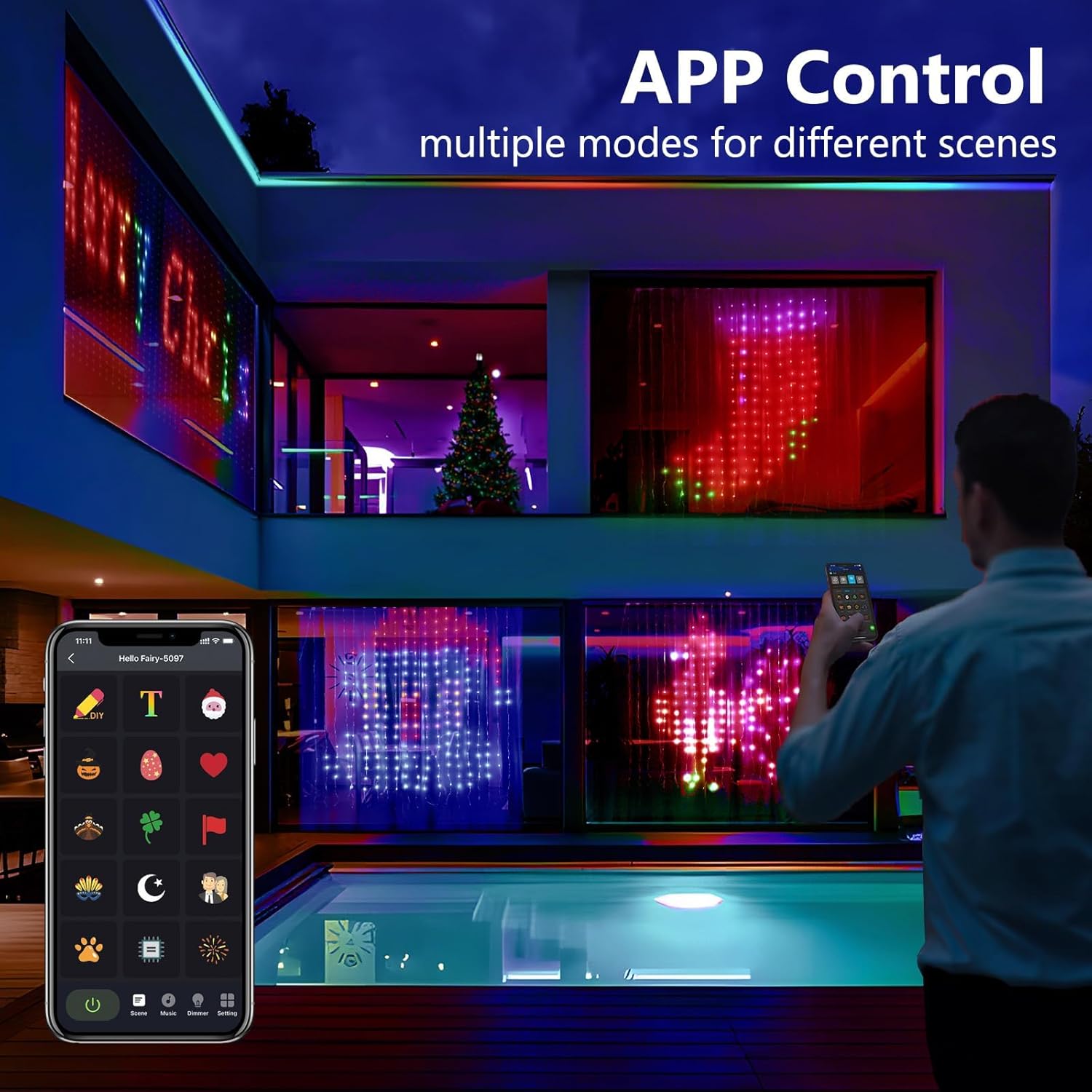 • ✨【MULTIPLE SCENES & DIY MODES】: Our remote offers access to 144 captivating holiday-themed patterns, including Christmas, Halloween, Easter, and more. You can adjust music sensitivity, light position, and speed directly from the remote. But via app, you can take it further by uploading your own photos or drawing custom designs. Create unique lighting effects by sketching a heart, writing “LOVE U,” or uploading any image to sync with your curtain lights, adding a personal touch to any scene.