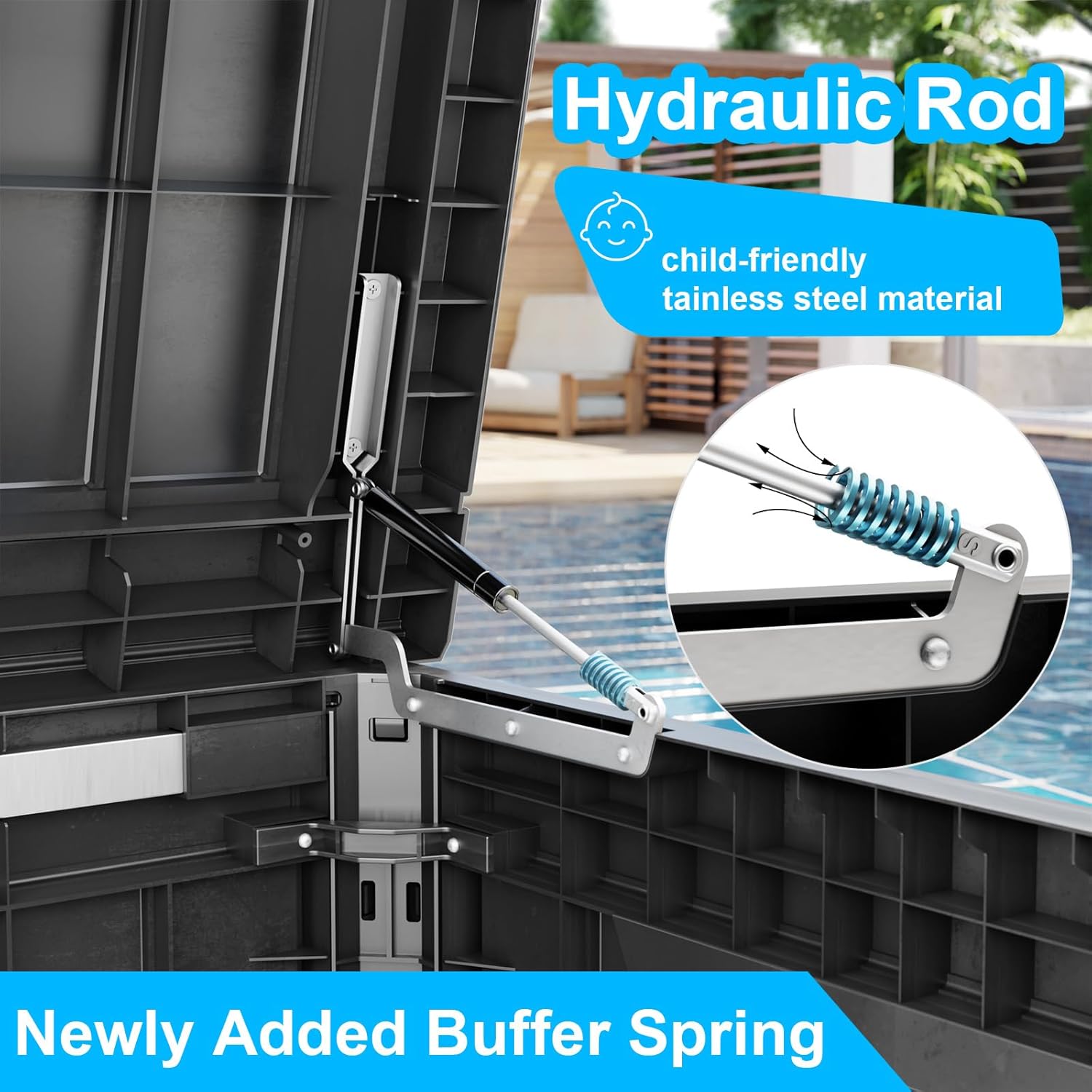 • Safety design: Each deck box has lockable holes (not included) for added security; in addition, the box is equipped with a hydraulic stand, which allows easy opening and slow closing and prevents hand pinching. The outdoor waterproof deck box has built-in handles on both sides, ensuring easy grabbing and moving