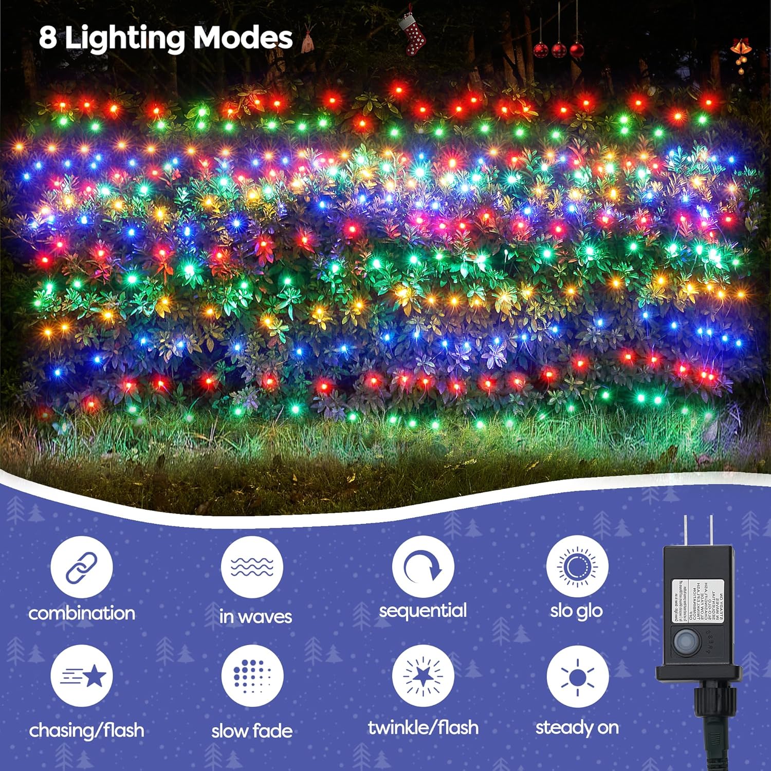 • 8 Lighting Modes &Timer Function: The outdoor Christmas netting lights features with 8 different lighting modes for you to choose from. It also comes with timer function, 6 hours on and 18 hours off. (long press the button, when it becomes green light, timer is activated.)