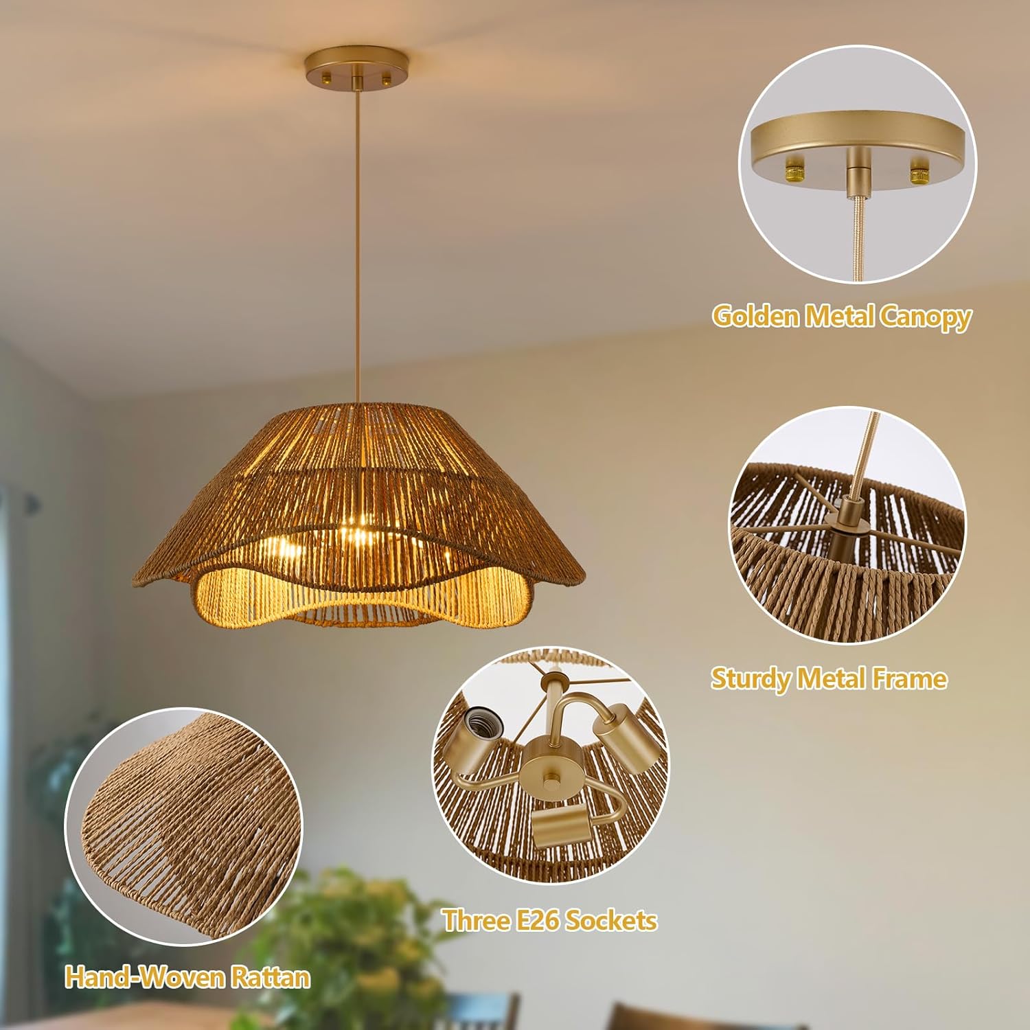 • 【Wide Applications】Rattan pendant light fixture exudes natural charm and is perfect for boho and rustic décor, creating a cosy and welcoming atmosphere, perfect for dining room, kitchen island, living room, bedroom, entryway or hallway, etc.