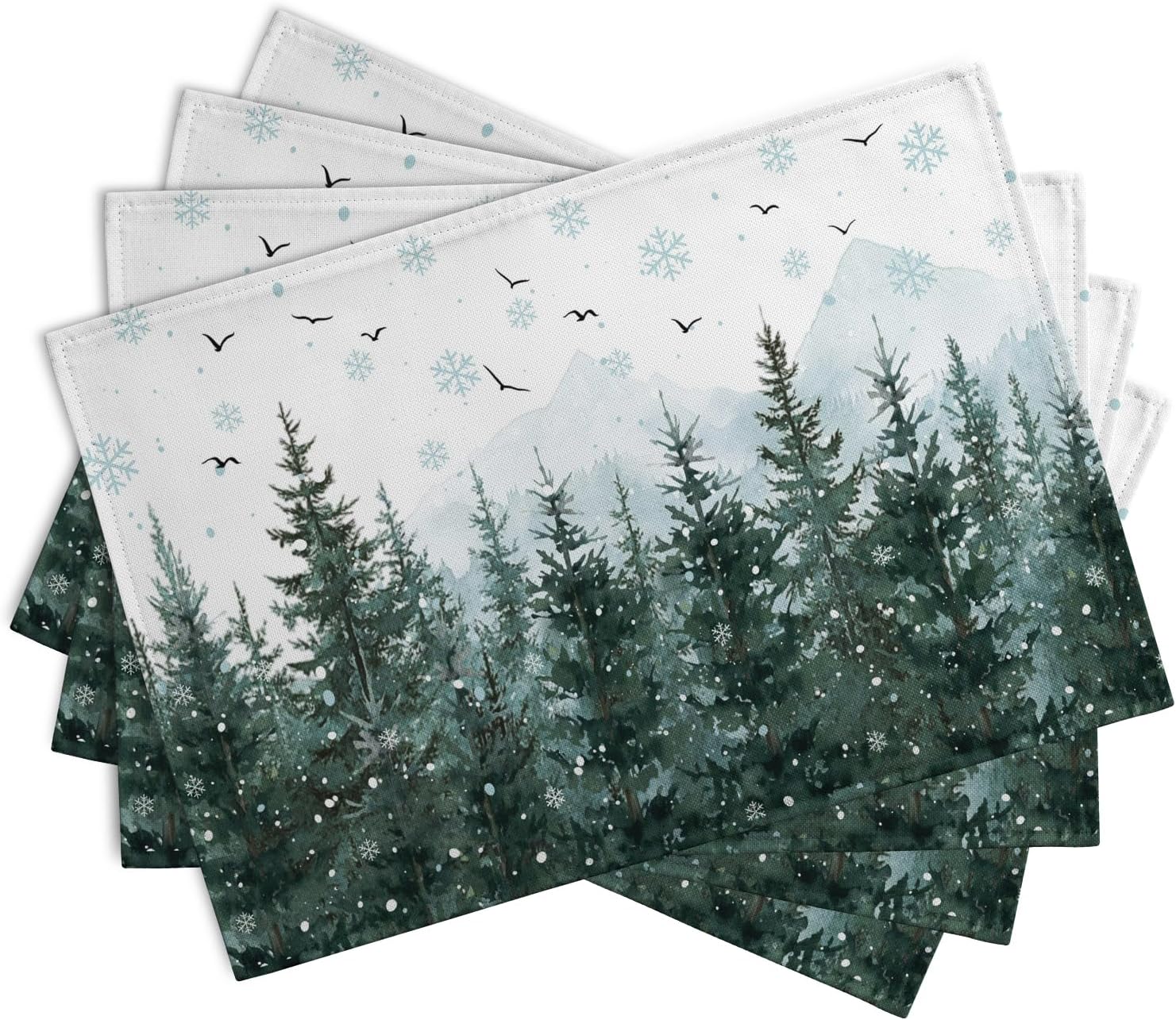 Winter Pine Tree Snowflake Placemats Set of 4 Christmas Snow Green Forest Place Mat 12x18 Inch Seasonal Xmas Holiday Rustic Nature Washable Fabric Table Mats for Farmhouse Kitchen Dining Decoration