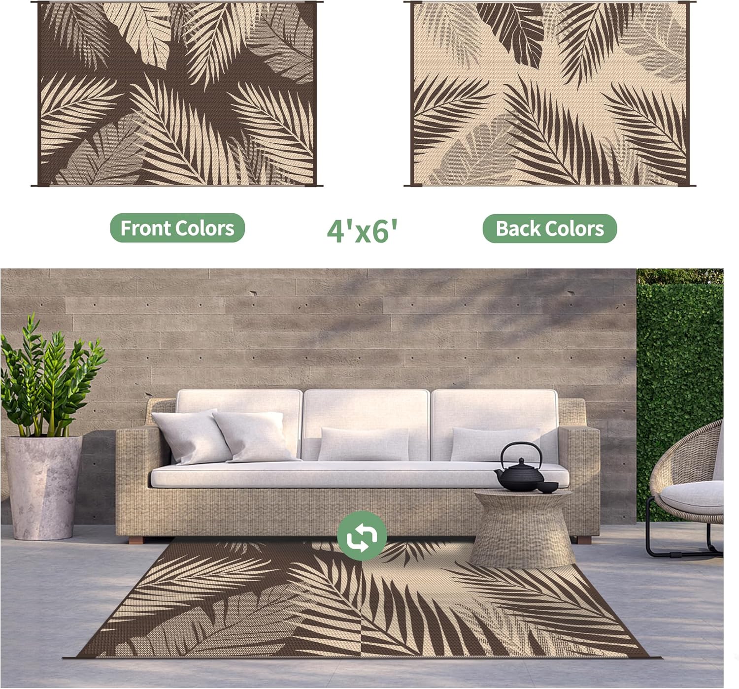 • Palm Leaf Design & Double-Sided Pattern: GENIMO reversible fall outdoor rug is designed with a double-sided pattern, completing the unique layout of multiple palm leaves. The 2 shades of coffee and beige achieve the ultimate fusion. Either side can blend perfectly with nature and look very full and comfortable, making it a versatile piece for fall decor