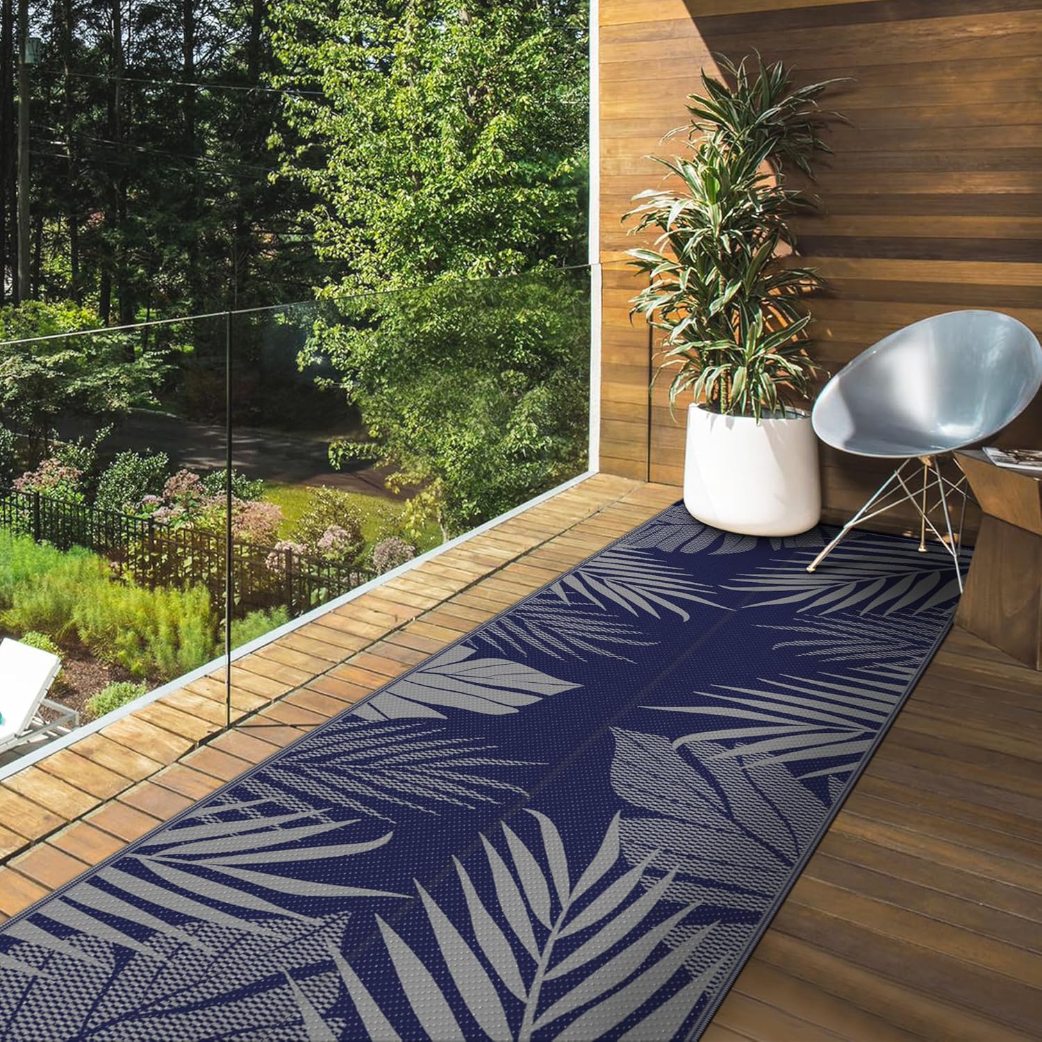 GENIMO Outdoor Rug 2.5' x 8' Waterproof for Patios Clearance, Reversible Outdoor Plastic Straw Camping Rug Carpet, Large Area Rugs Mats for RV, Camper, Deck, Balcony, Porch, Beach, Picnic, Blue&Grey