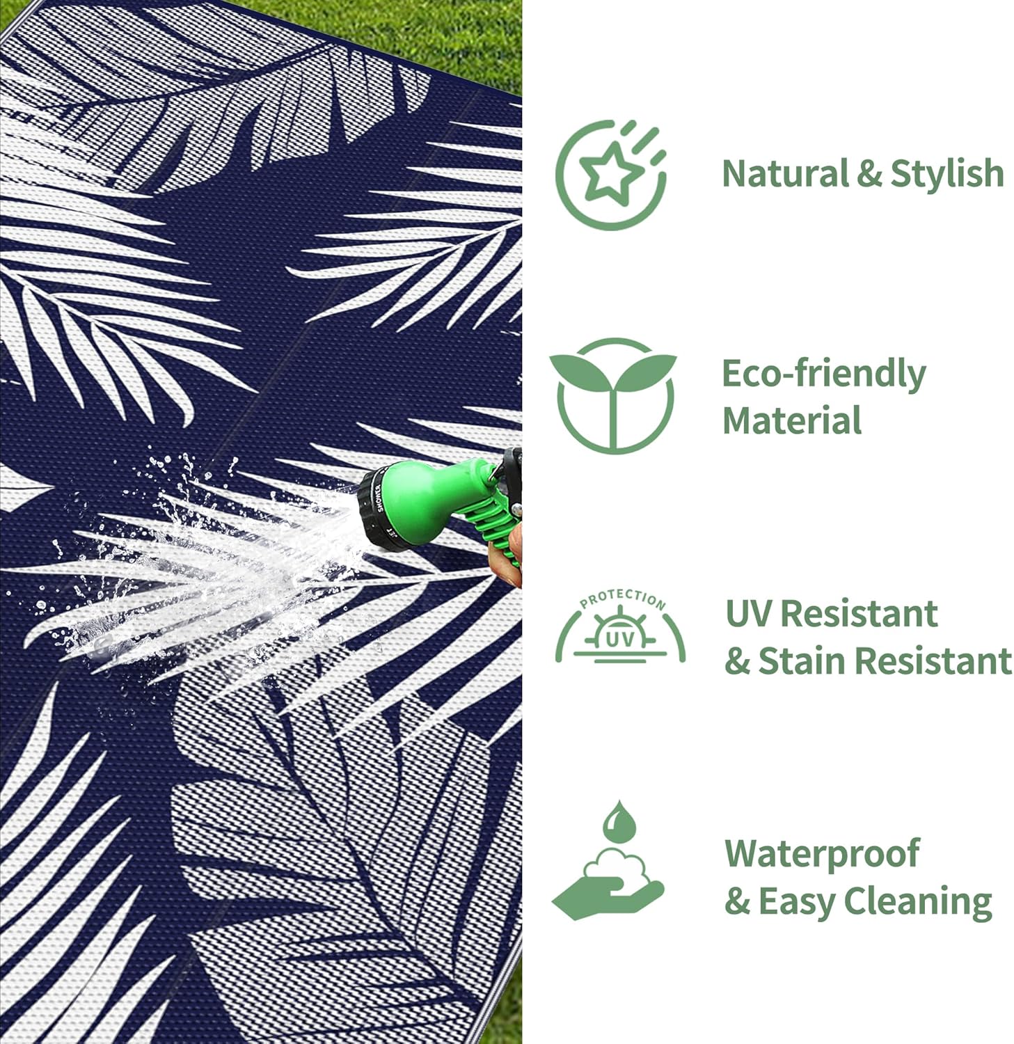 • Waterproof & Easy To Clean: Our indoor and outdoor rugs are waterproof, stain resistant, non-slip, easy to clean and well-breathable. As an outdoor patio rug or picnic mat, you don't have to worry about drink spills, food stains, sand or dirt, just rinse with water or wipe with a damp cloth. Plus, the breathable material allows it to air dry in minutes. You can enjoy your exclusive leisure time with your family or friends outdoors or indoors without any worries