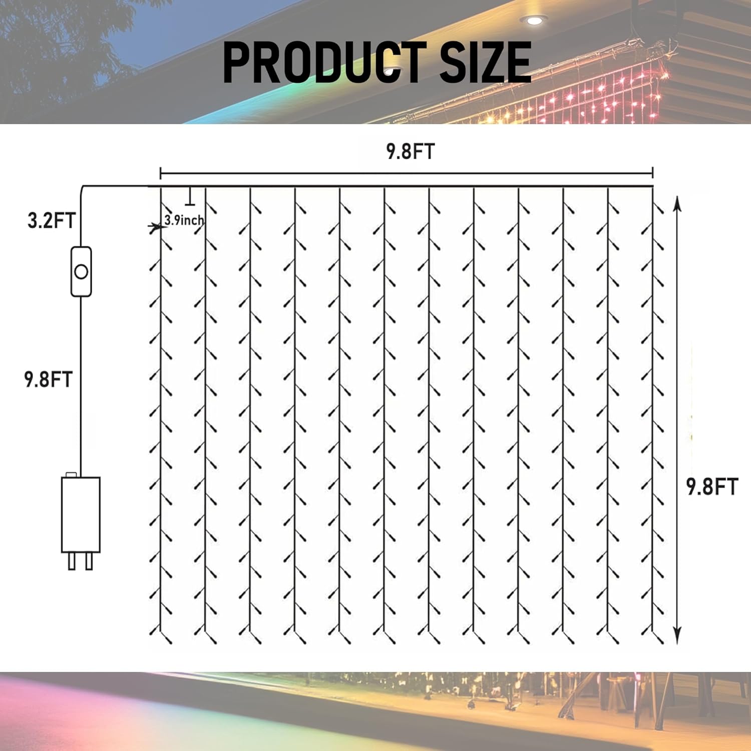 • 16 Million Colors & Multiple Scenes: Transform your holiday decorations with smart Christmas curtain lights that offer an incredible 16 million colors and various modes. The size is 9.8 FT X 9.8 FT, the lead length is 13 FT, and the horizontal distance between each lamp bead is 3.9 inch. Perfect for enhancing the atmosphere during Christmas, Halloween, 4 of July, Easter, Valentine's Day, St. Patrick's Day, Thanksgiving, New Year, weddings, and birthdays.