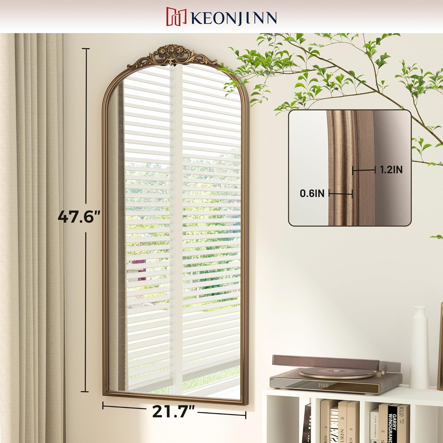 Keonjinn Arched Gold Wall Mirror, 48" x 22" Vintage Wall Mirror with Metal Frame, Traditional Brass Mirror, Decorative Baroque Mirror for Hallway, Fireplace, French Cleat Mounting
