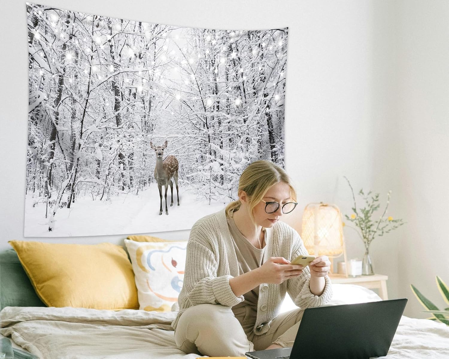 QGHOT Winter Tapestry Wall Hanging Snow Scene Backdrop Winter Wonderland Wall Decor Snowy Forest Wall Art Nature Woodland Deer Tapestry for Bedroom Room Dorm Party Decoration, Extra Large