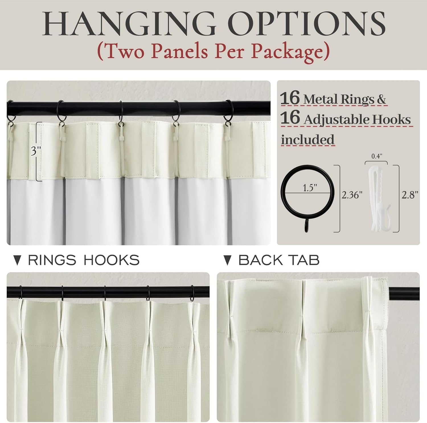 • Ready Made:Set of 2 pinch pleated curtain panels per package with 16 metal rings and 16 adjustable plastic hooks(The adjustable hook can raise and lower the height of the curtain by 1 inch),Each panel measures 40"W x 100"L,pair measures 80"W x 100"L