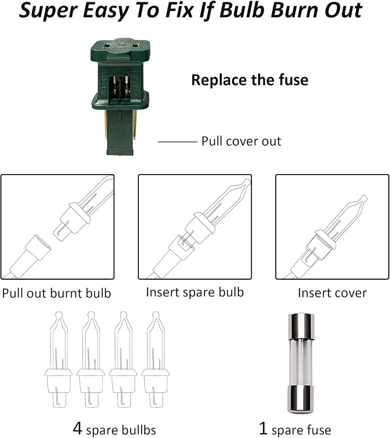• High Quality: The Christmas tree lights is IP 44 waterproof, build-in 3A fuse and pass with UL certified, is safety for both indoor and outdoor decorations. Each bulb works individual, others will work well when one bulb is defective. Just use the spare bulbs to replace the defective bulb.