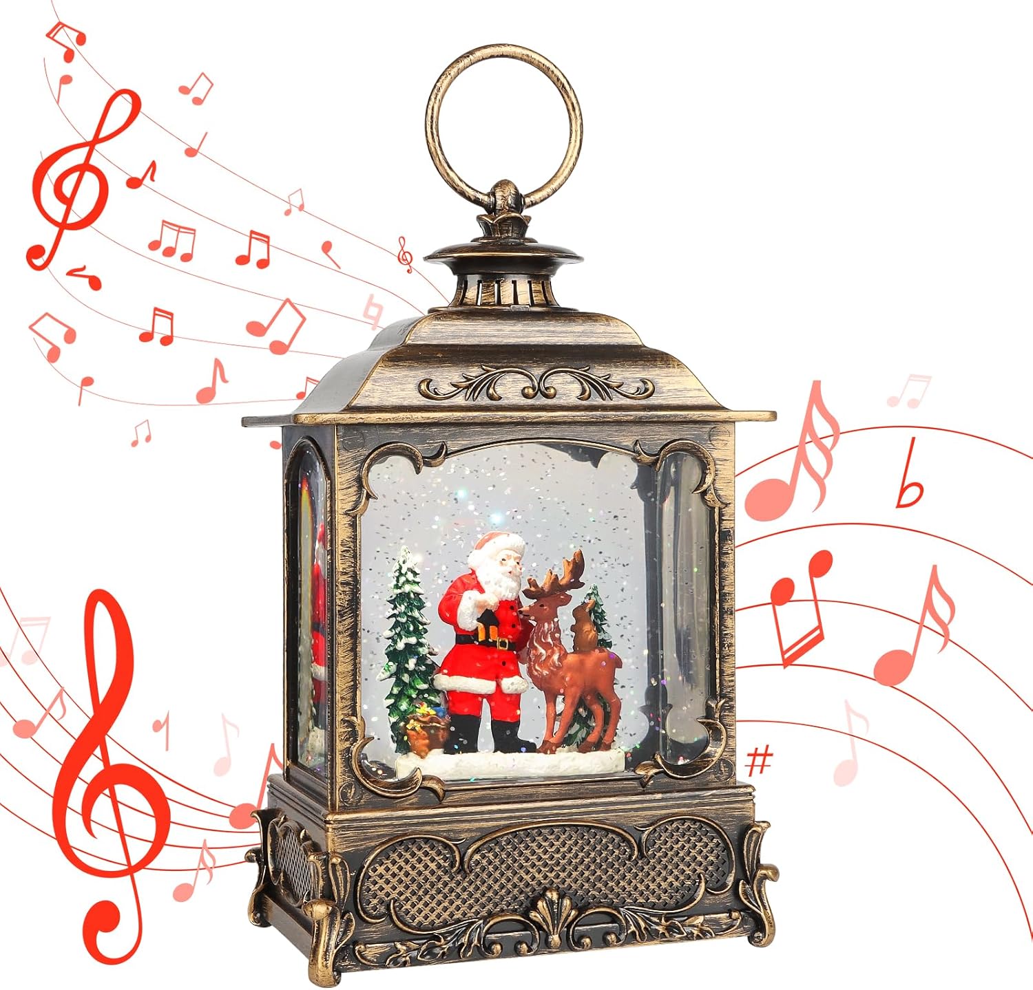 • USB & Battery Powered:Christmas Snow Globe Lantern that can be powered by USB cable (included) or 3 AA batteries (not included). The rotating water glitter lantern creates a festive atmosphere with snowy scenes and warm lights.