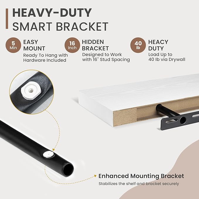 • [STABLE & SECURE INSTALLATION]: Equipped with a robust, hidden mounting bracket, these 36 inche floating shelves provide solid support for your items. Designed for easy, secure installation, they include all necessary hardware for a firm, wobble-free setup, so you can confidently display decor, photos, or functional items with style.