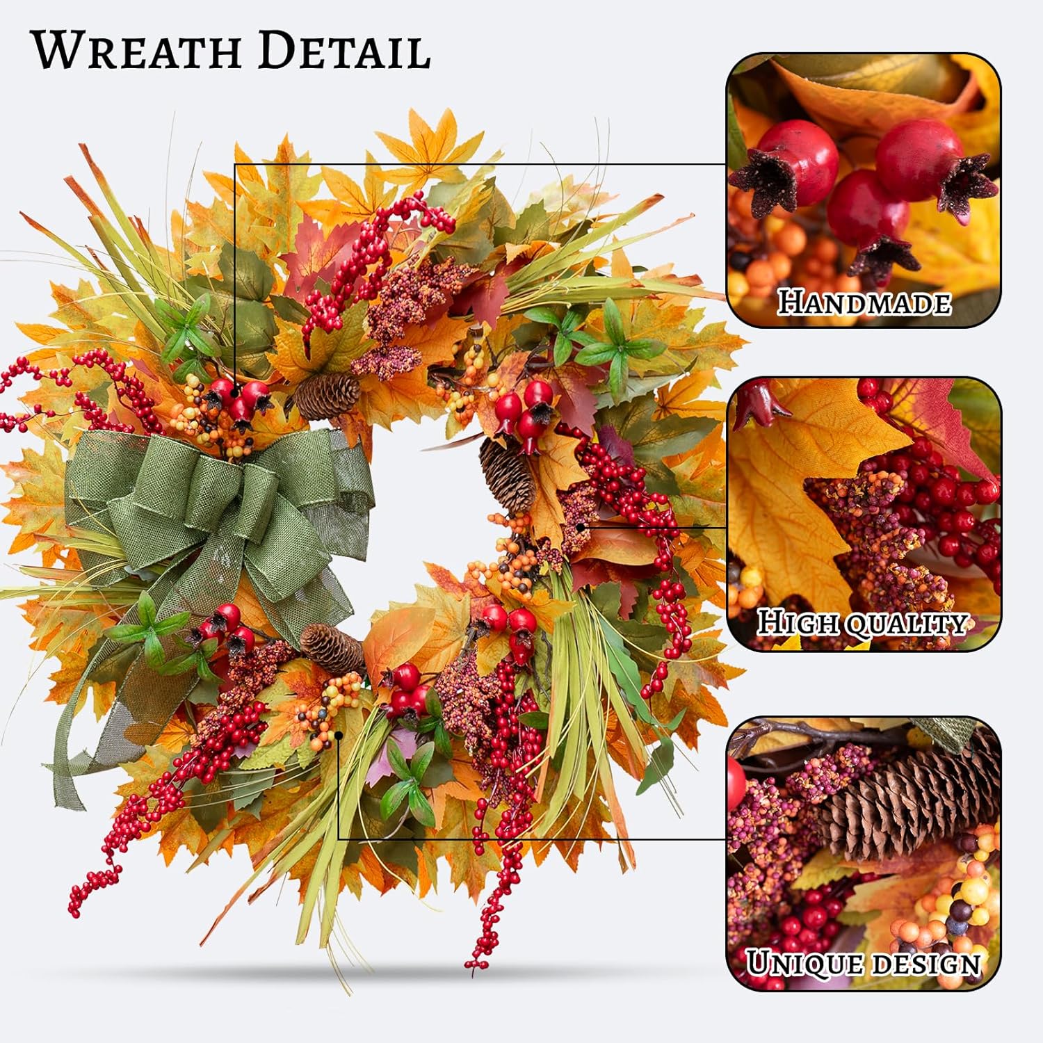 • 【Vibrant & Lifelike Fall Door Wreath】This 24 inch autumn wreaths for front door is filled with lifelike autumn leaves in warm tones, red berries, pine cones, and a charming green bow. It adds a stunning seasonal touch to your front door decor