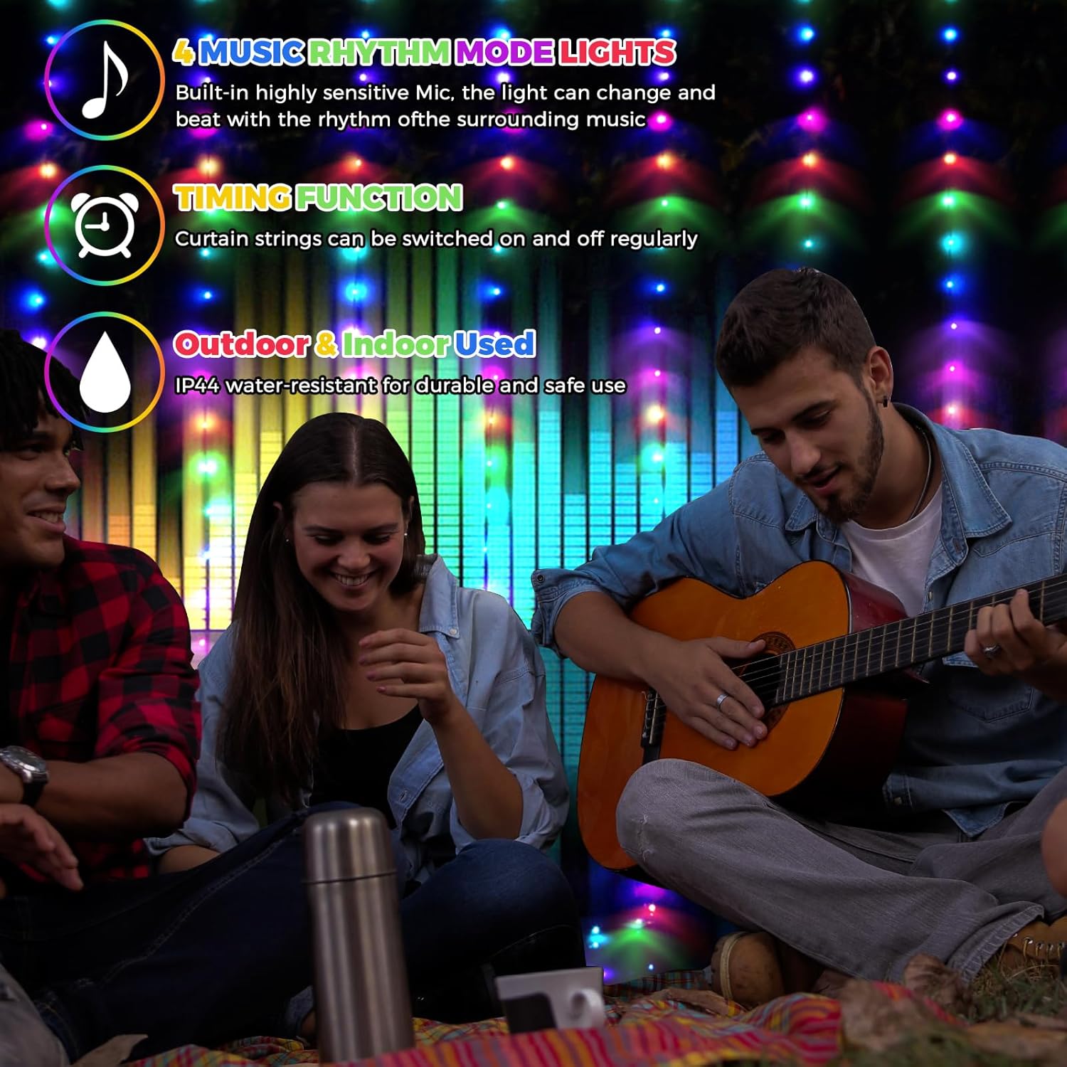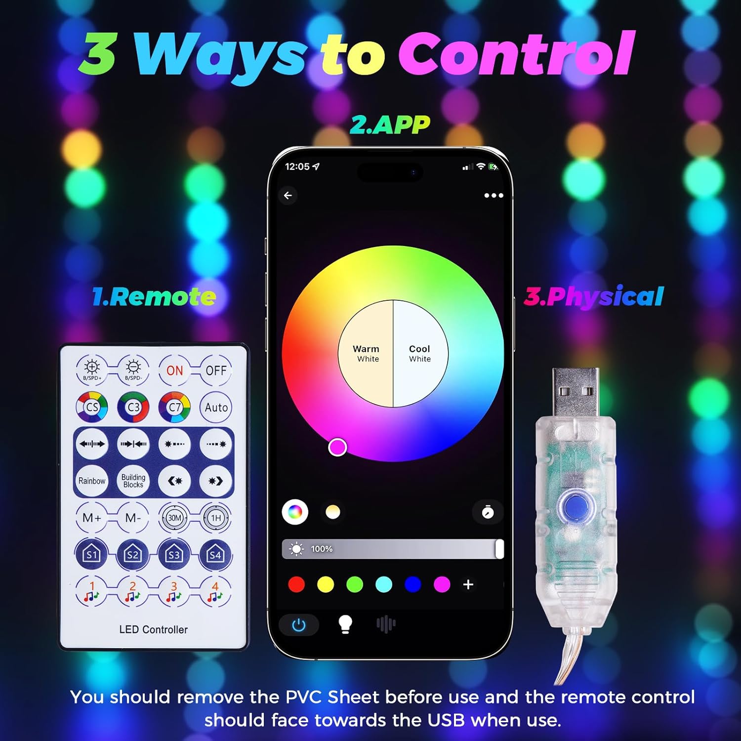 • App Functions: You can choose hundreds of colors through app. And allows the timer function to accurate to the second. App also allow your playlists to sync with the DIY curtain string lights, the light can change and beat with the rhythm of the surrounding music