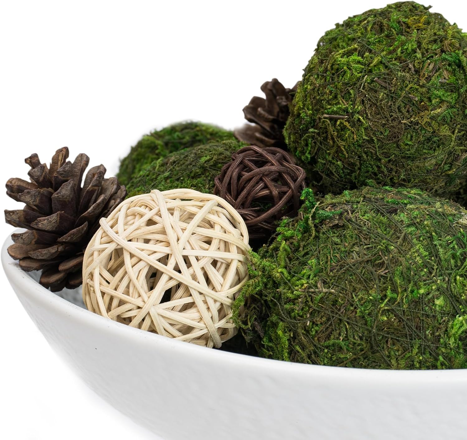 • Complete Decorative Set: The package includes a beautifully textured ceramic bowl and 16 decorative balls—10 moss balls, 6 rattan balls, and 2 pine balls. This set offers rich detail and durable quality, making it a striking addition to any space.