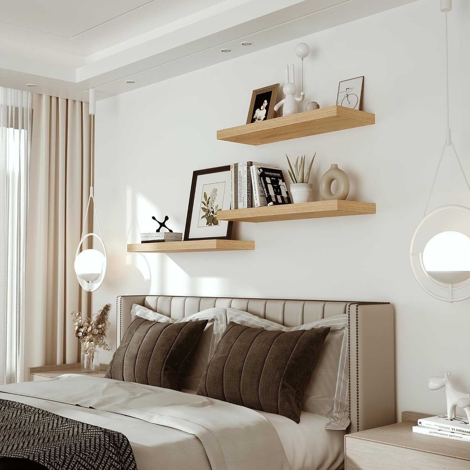 • Well-designed Floating Shelves - The rustic style floating shelves combining both practicality and style. These shelves offer a generous deeper and thicker surface, perfect for organizing daily sundries without taking up valuable floor space. The various of selected colours finish adds a cozy, natural element,display your art pieces on the wall to decorate your home, and make it full of aesthetic flare.