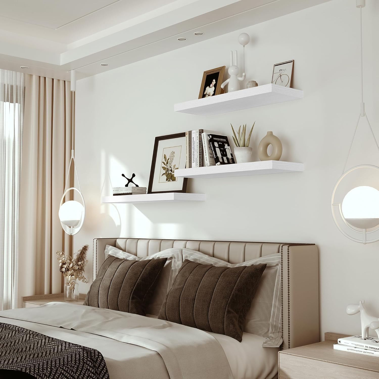 • Well-designed Floating Shelves - The rustic style floating shelves combining both practicality and style. These shelves offer a generous deeper and thicker surface, perfect for organizing daily sundries without taking up valuable floor space. The various of selected colours finish adds a cozy, natural element,display your art pieces on the wall to decorate your home, and make it full of aesthetic flare.