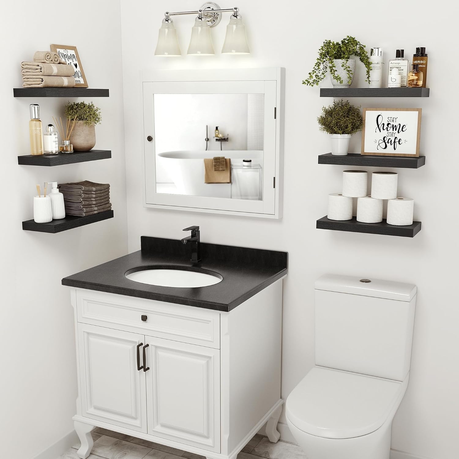 • Engineered Wood & Wall Mounted Design - Slight color differences may occur due to lighting and screen settings.Our MDF bathroom floating shelves for wall are made of wood which grows naturally, so each piece of the board has unique natural wood grain and color. Through the simplest charcoal roasting process, we restore the carbonized color and texture of the wood itself. It highly recommend them for anyone looking to add functional and stylish storage to their bathroom space.