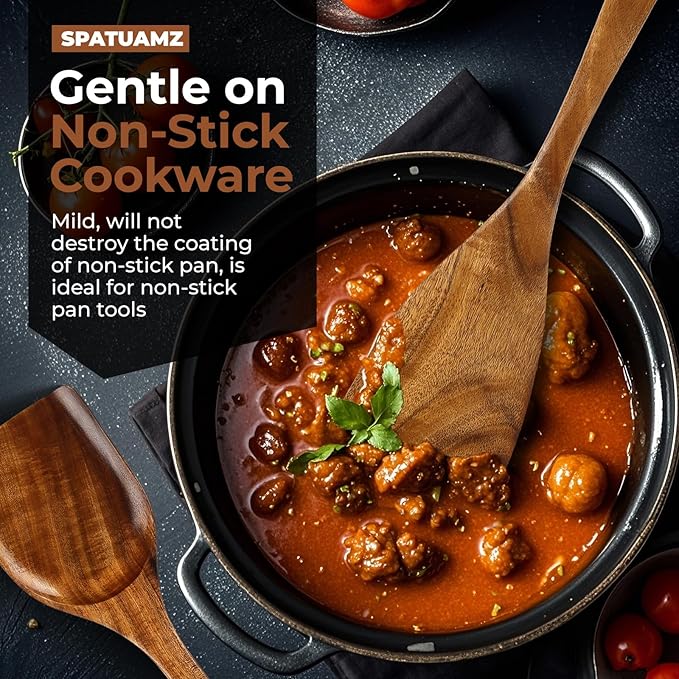 • 【Safe for Nonstick Cookware – Durable & Heat-Resistant】: Our teak wood utensils are perfect for nonstick cookware, preventing scratches or damage to your pans. These utensils are strong, long-lasting, scent-free, and heat-resistant, making them ideal for high-temperature cooking