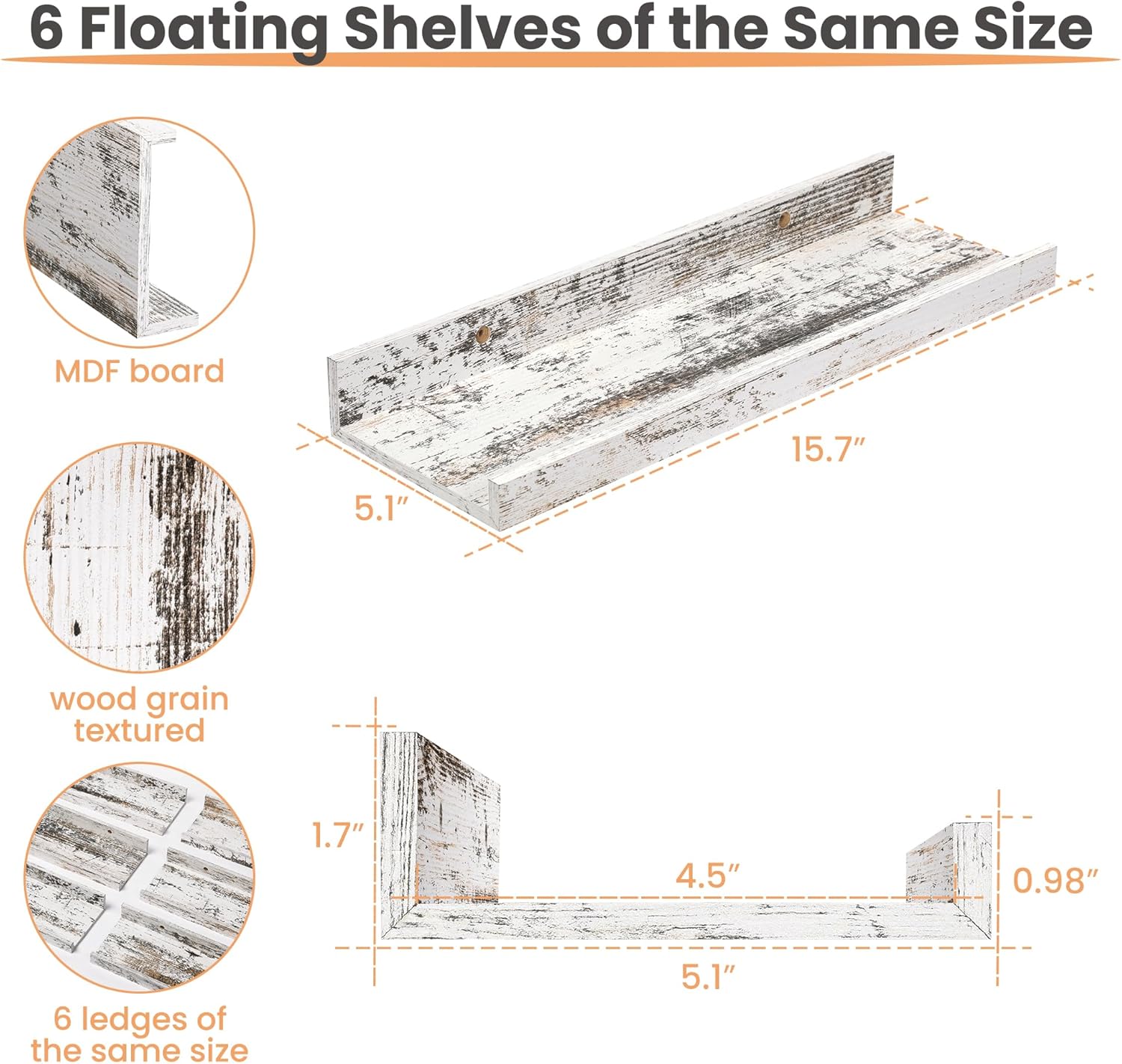 upsimples Floating Shelves for Wall, Wall Shelves for Decor Storage Set of 6, Wall Mounted Wood Shelf for Bedroom, Living Room, Bathroom, Kitchen, Picture Ledge Shelf, Rustic White