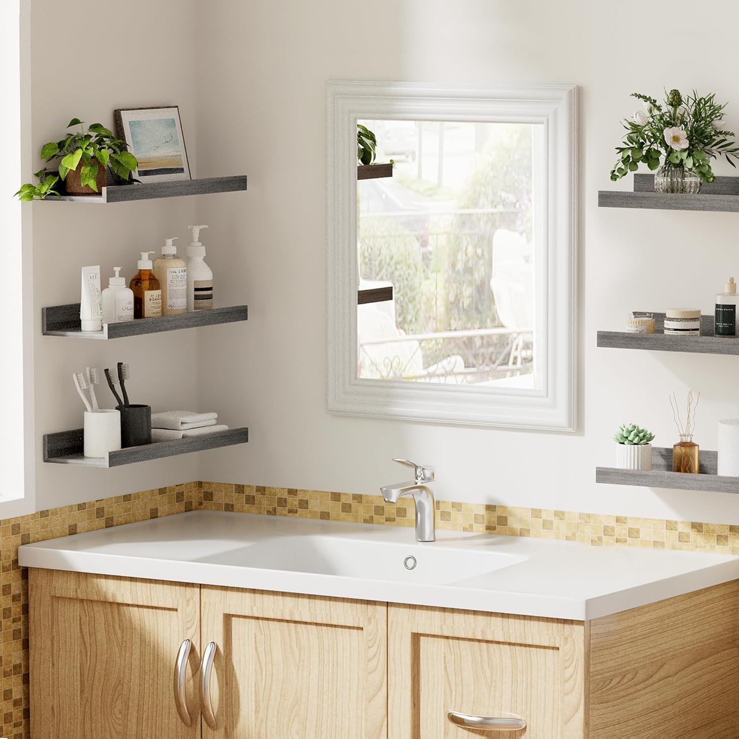 upsimples Floating Shelves for Wall, Wall Shelves for Decor Storage Set of 6, Wall Mounted Wood Shelf for Bedroom, Living Room, Bathroom, Kitchen, Picture Ledge Shelf, Grey