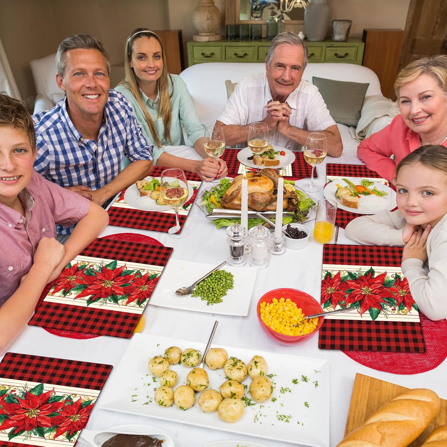 • Eye-Catching Design: Elevate your dining experience with our Christmas table decoration supplies. The Christmas poinsettia table mats feature bright colors and a classic Christmas design with red and black plaid and an elegant poinsettia pattern. These Xmas dining mats add a touch of brilliance to your Christmas dinner table. Impress your guests and create an unforgettable cheerful atmosphere for your party.