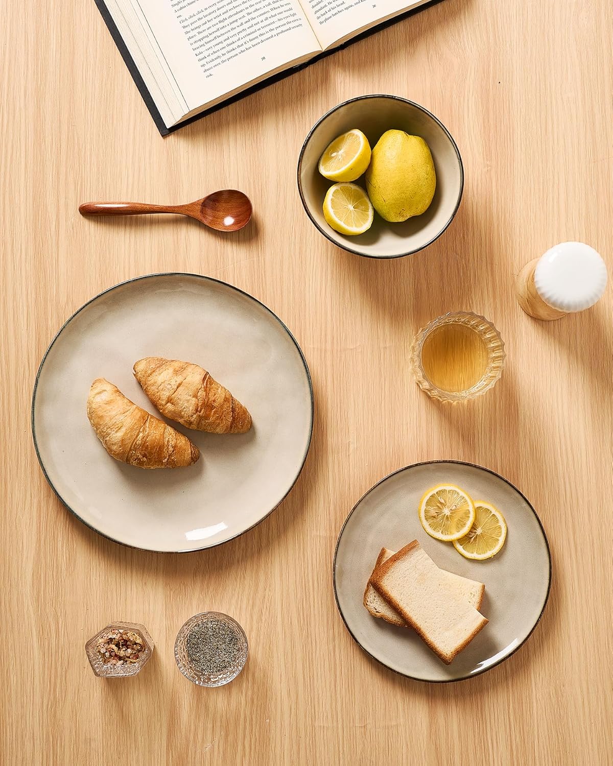Famiware Dinnerware Sets for 8, Ocean Round 24-Piece Kitchen Plates and Bowls Sets, Microwave and Dishwasher Safe, Scratch Resistant, Light khaki