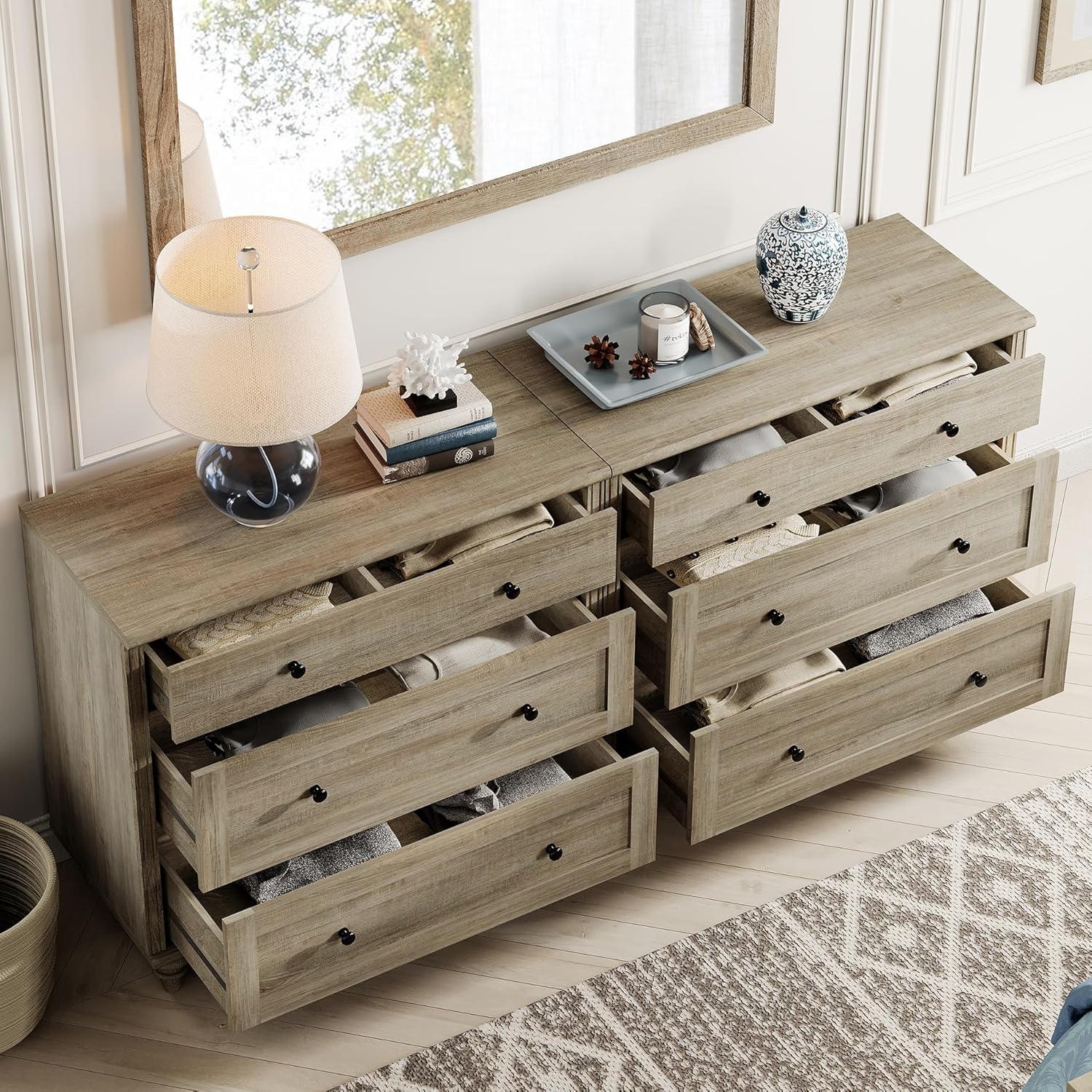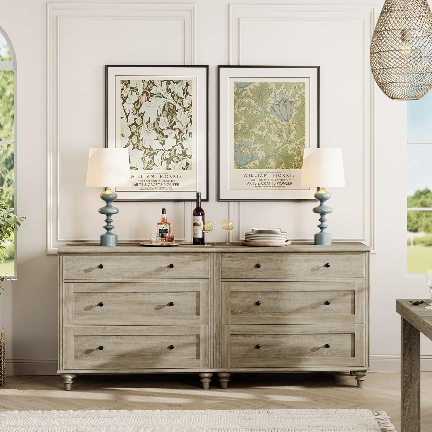 • 【2-in-1 Multipurpose Dresser】The 2-in-1 large dresser can be used together as 6 drawer dresser or tv stand for 75 inch tv, or used separately as two 3 drawer dressers.With distresser suface is very classic and elegant which blends in easily with any decor. It is ideal as a baby dresser, kids dresser and console table, etc.