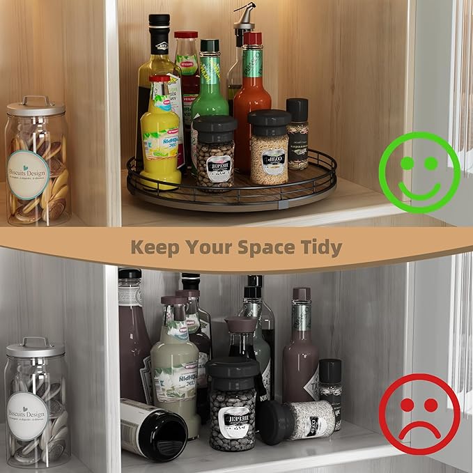 • 360°Smooth Rotation - The lazy susan turntable rotates smoothly and silently, placed next to the stove for easy access to condiments, spices, olive oil and cooking supplies. Placed next to the sink to display soap lotion. Thoughtful kitchen countertop organizers to rid your life of clutter!
