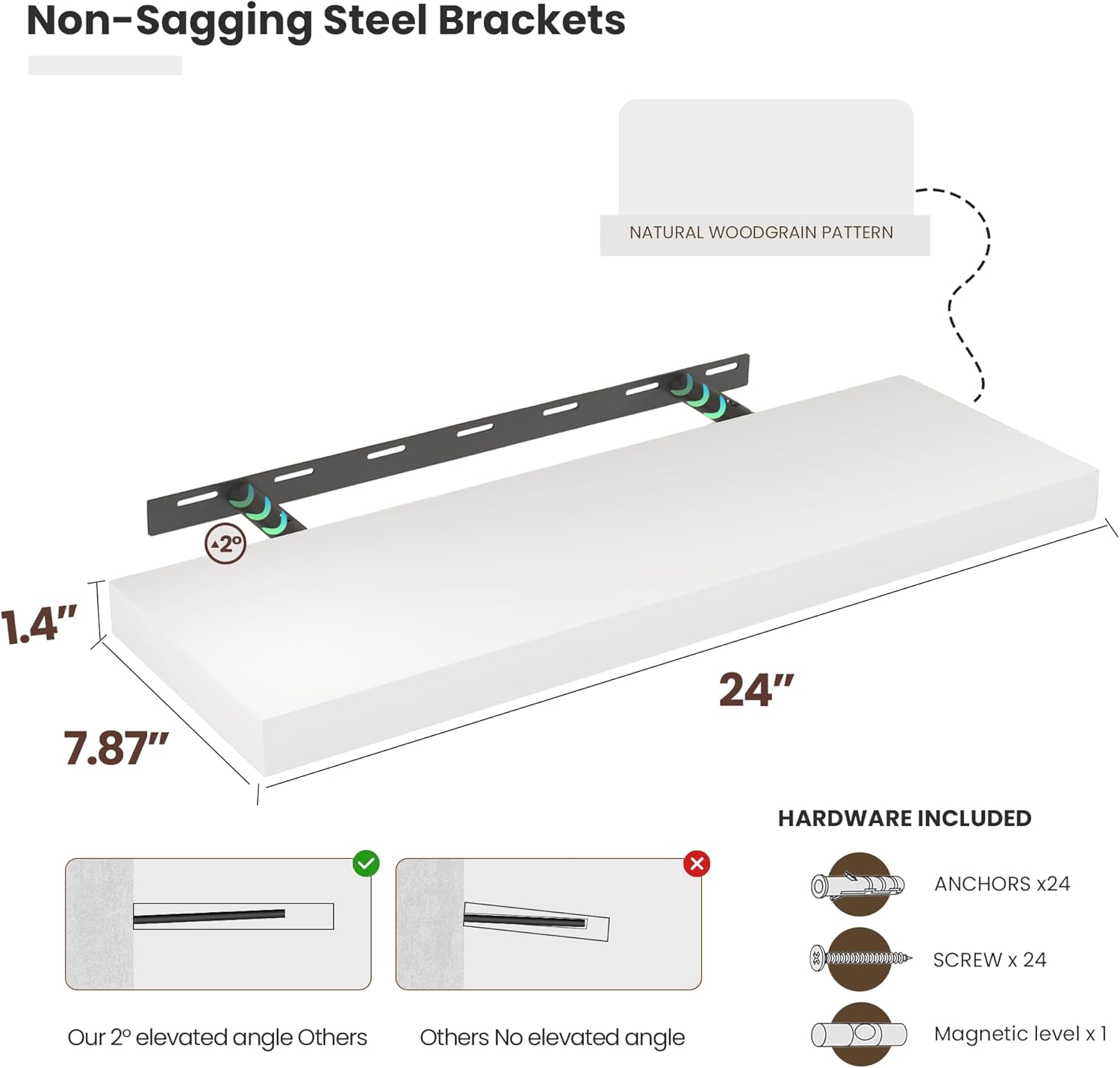 • Premium Wooden Floating Shelves -Unlike others, they are beautifully-finished, fantastic-smelling solid pine,and they are handcrafted out of finest solid pine wood measuring 24" x 8" x 1.38",revealing its own character of knots and natural wood grain, making each ledge a little different but equally stunning.