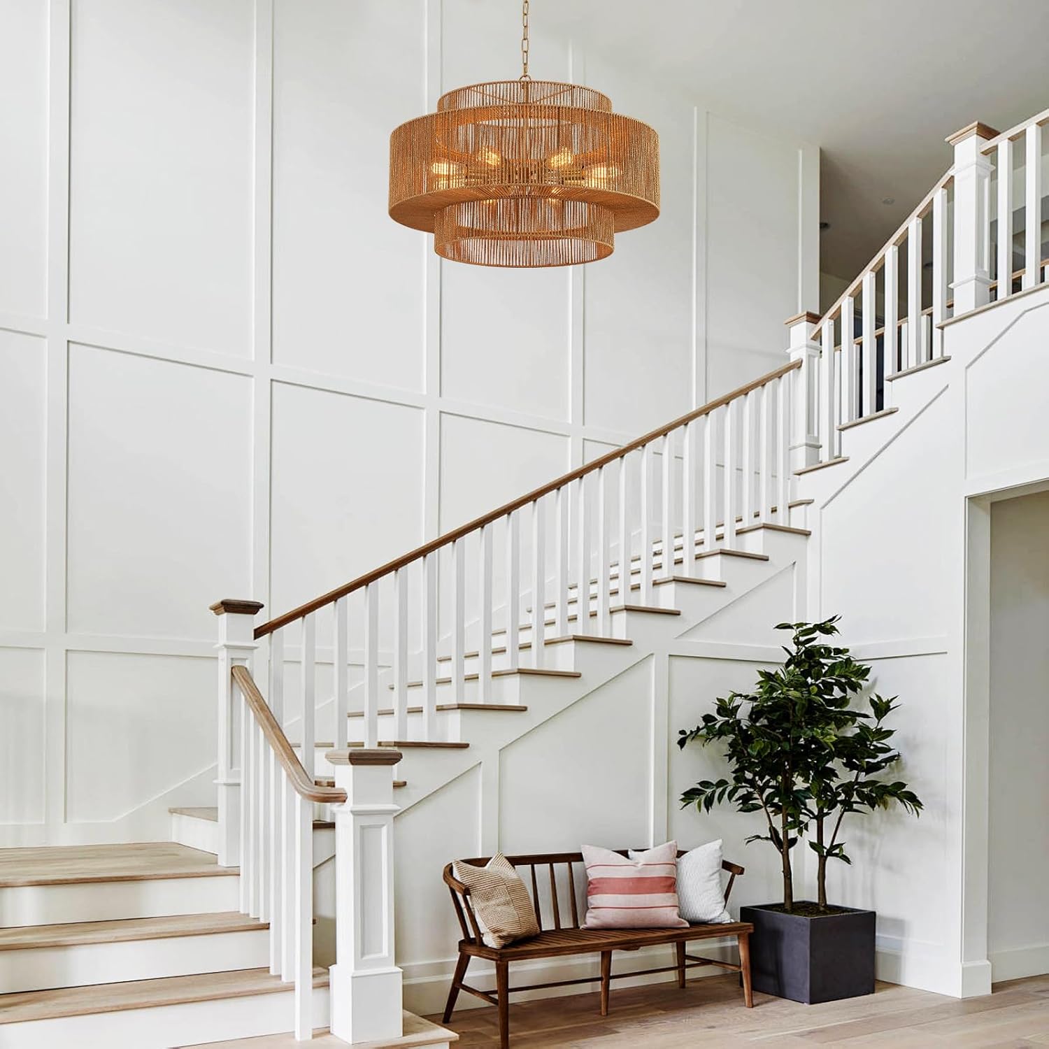 • 【3-Tire Design】The large 3-tier rattan chandelier's simple wicker weave and golden finish metal frames bring a vintage bohemian style. This big farmhouse chandelier light fixture features three round metal frames that form a captivating semicircular hollow cage. This design sets it apart, adding an element of sophistication.