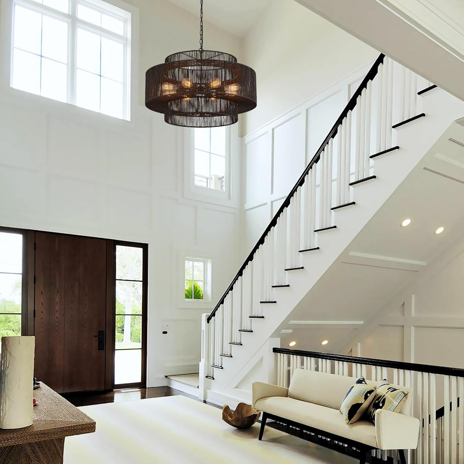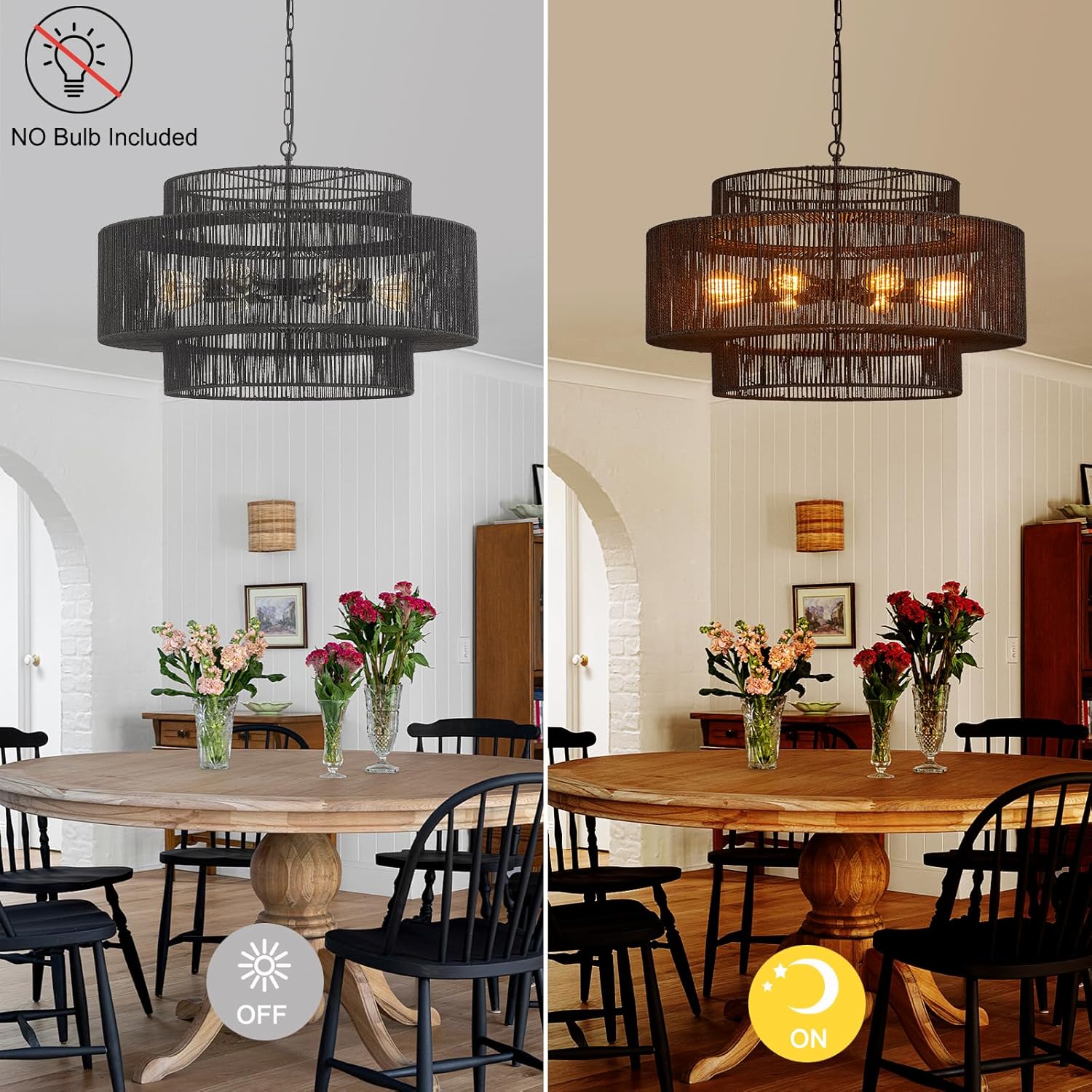• 【3-Tier Design】The 3-tier rattan black chandelier's simple wicker weave and black finish metal frames bring a vintage bohemian style. This farmhouse chandelier light fixture features three round metal frames that form a captivating semicircular hollow cage. This design sets it apart, adding an element of sophistication.