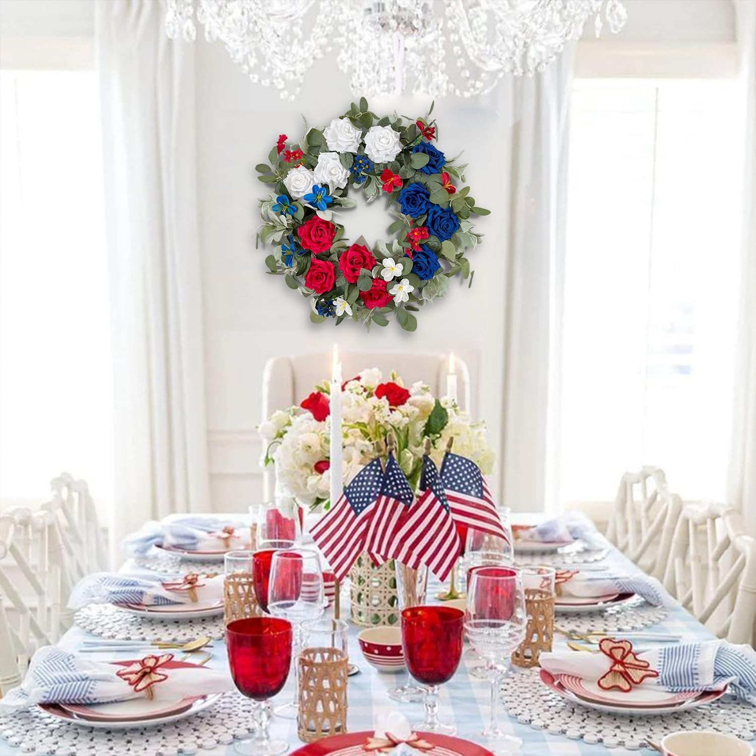 • ①【Faux Patriotic Wreath】-This patriotic wreath is used multiple material of flowers and leaves,premiun! The bright red white and blue roses mix which looks very eye-catching.Different kinds of leaves such as Eucalyptus leaves add colors, texture and dimension to doors, walls or above mantels.Rich appreance!