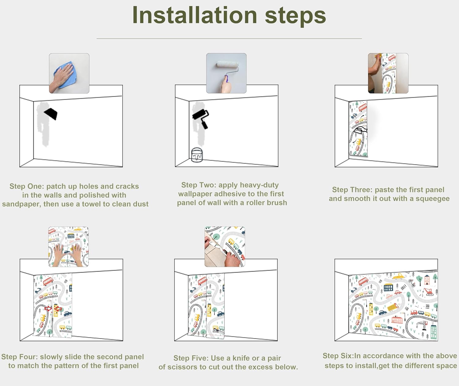 • INSTALLATION - 1.Fill in all cracks or holes and clean dust dirt and grease on the wall surface. 2. Apply the heavy duty wallpaper paste on the wall not mural. 3. Use a spirit level to mark first strip location. 4. match the pattern by sliding into place. 5.use a scraper to smooth out bubbles press. 6. Let dry for a few minutes and that's it! Please Note: Not self-adhesive. We recommend to use a standardized fleece wallpaper paste.
