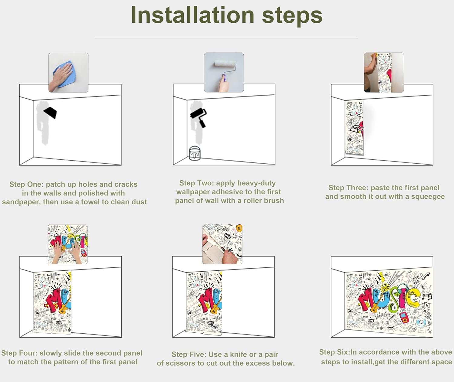 • INSTALLATION - 1.Fill in all cracks or holes and clean dust dirt and grease on the wall surface. 2. Apply the heavy duty wallpaper paste on the wall not mural. 3. Use a spirit level to mark first strip location. 4. match the pattern by sliding into place. 5.use a scraper to smooth out bubbles press. 6. Let dry for a few minutes and that's it! Please Note: Not self-adhesive. We recommend to use a standardized fleece wallpaper paste.