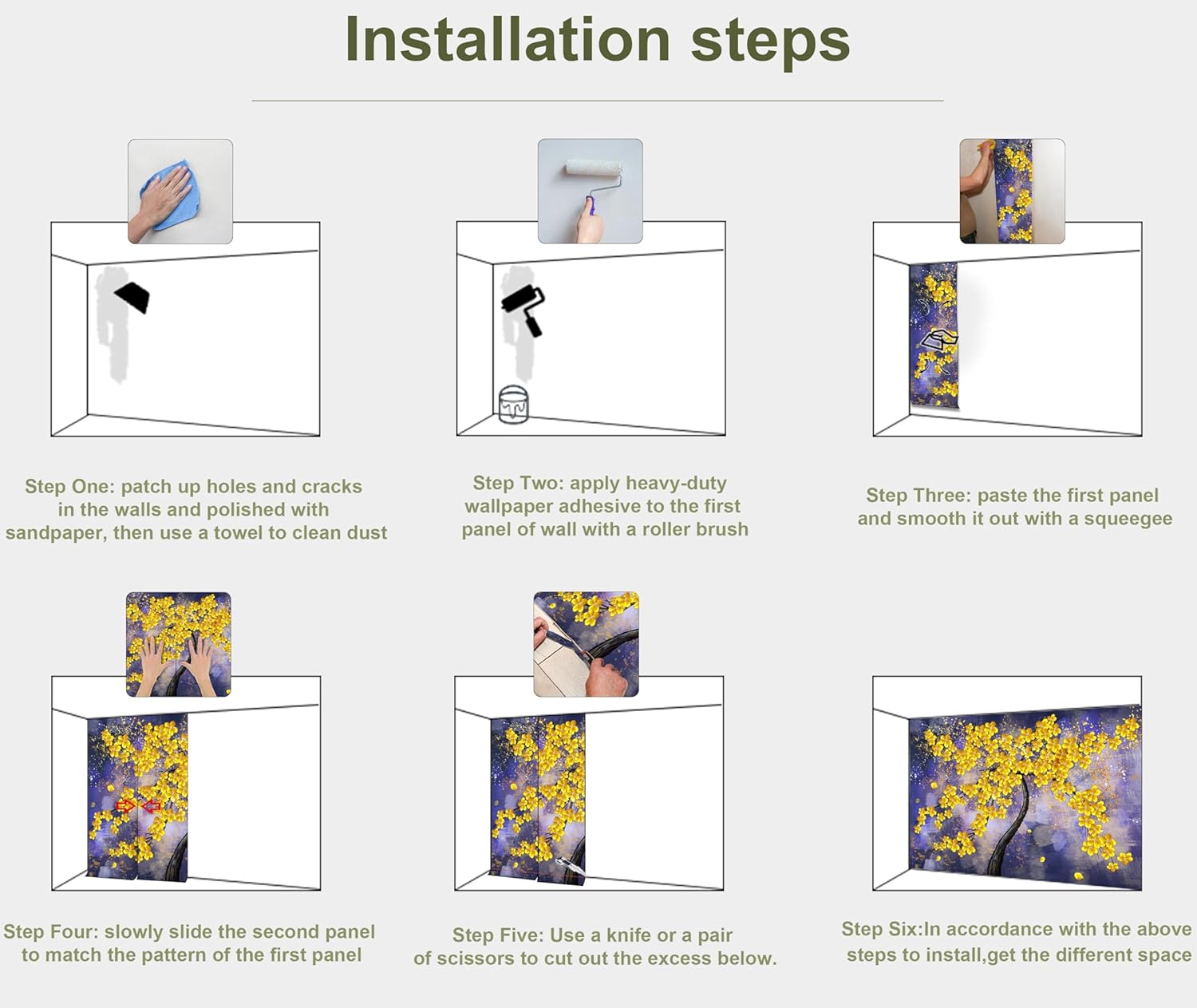 • INSTALLATION - 1.Fill in all cracks or holes and clean dust dirt and grease on the wall surface. 2. Apply the heavy duty wallpaper paste on the wall not mural. 3. Use a spirit level to mark first strip location. 4. match the pattern by sliding into place. 5.use a scraper to smooth out bubbles press. 6. Let dry for a few minutes and that's it! Please Note: Not self-adhesive. We recommend to use a standardized fleece wallpaper paste.